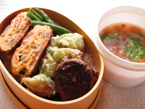 本日 のりごはん ちくわ磯部揚げ きのこきんぴら入りたまごやき いんげんごまあえ 焼き椎茸にポン酢をかけたもの おみそしる なめこととうふ今日もあり合わせのものをどうにか形にしたというお弁当ですが、ちくわの磯部揚げはうちのメンバーに人気のおかず。…