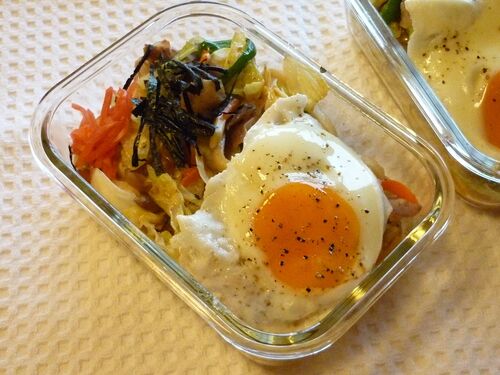 本日 やきうどん きゃべつ にんじん まいたけ 豚バラ 目玉焼き こういう麺に目玉焼きを添えるっていうのをばかの一つ覚えのように繰り返している芸のないお弁当ですが、この目玉焼きって最近しみじみすごくおいしいと思うようになりました。 だしまきやオム…