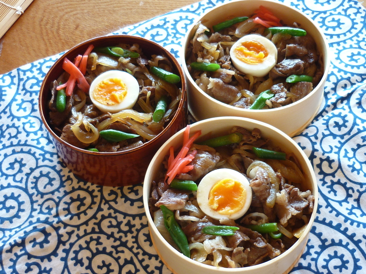今日の牛丼、お肉が良いからすごく美味しくできました。冷凍にしてある牛肉が何種類かあるけれど、牛丼用のお値打ちこま切れお肉と間違えて、すき焼き用のたぶんいいやつだと思う。薄く大きなお肉なのに包丁で3等分くらいに切って使いました。